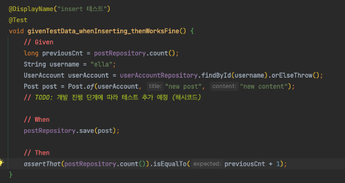 ⇒ JpaConfig 클래스에 정의된 JPA Auditing 기능과 AuditorAware 빈이 현재 애플리케이션 컨텍스트에 포함되며, 이를 통해 Post와 같은 엔티티에서 Auditing 필드(createdAt, createdBy, modifiedAt, modifiedBy)가 정상적으로 작동한다.